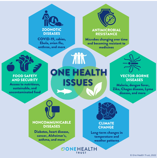 One Health is a collaborative, transdisciplinary approach that promotes optimal health by recognizing the interconnectedness of people, animals (both domestic and wildlife), plants, and the environment we share. Its importance has grown in recent years as interactions among these systems have evolved, intensifying human–animal–environment interfaces. Factors such as demographic expansion, land use changes, and increased international movement have contributed to these shifts, creating more opportunities for zoonotic disease transmission and underscoring the need for coordinated surveillance, prevention, and response efforts (CDC - One Health).