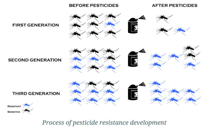 Fact: Mosquitoes are becoming increasingly resistant to pesticides. Mosquitoes that survive pesticide treatment can pass this ability on to their offspring increasing the total number of pesticide-resistant mosquitoes over time. Pesticides targeting mosquitoes usually fall under one of two categories: larvicides, which are more common, and adulticides (Pesticide Resistance Monitoring Program). Studies have demonstrated widespread resistance to Methoprene and varying levels of resistance for other larvicides such as Lysinibacillus sphaericus and Spinosad in both Culex and Aedes mosquito species. Mosquitoes carry zoonotic viruses such as West Nile, eastern equine encephalitis and Cache Valley viruses, making vector control an important One Health issue. Monitoring for pesticide resistance is critical with rising resistance rates and the expansion of mosquito habitats.